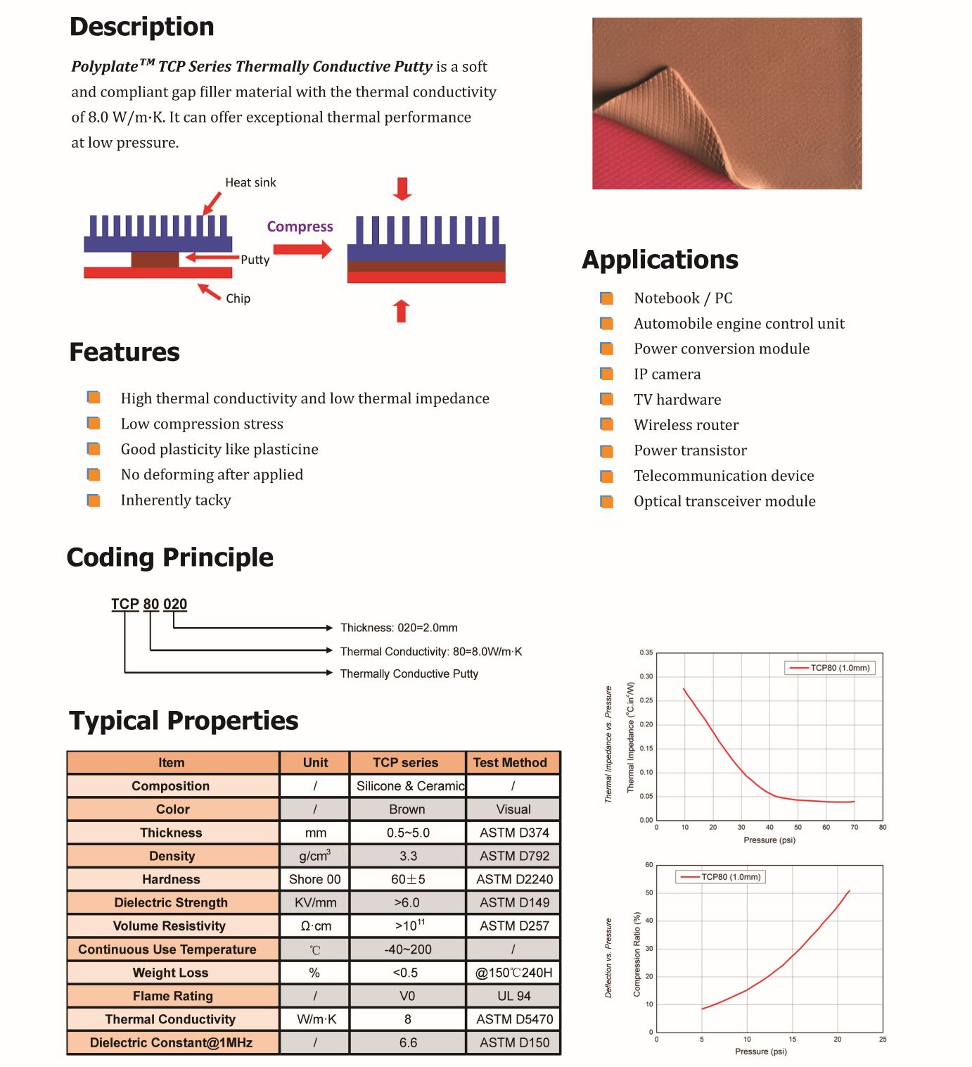 PolyplateTM TCP系列導(dǎo)熱泥是一種柔軟的具有導(dǎo)熱性的柔性間隙填充材料。導(dǎo)熱系數(shù)為8.0 W/m·K,可以在低壓下提供卓越的熱性能。