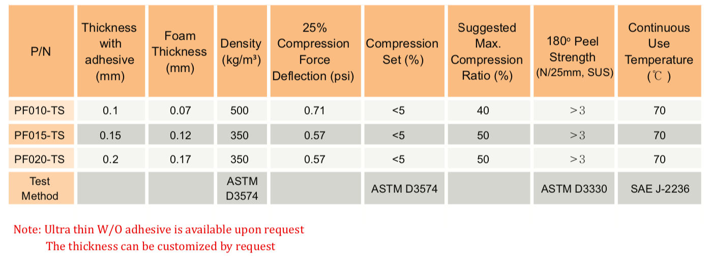 TM PF-TS系列是一種超薄、高性能的泡棉,用于電子設備的緩沖、保護性密封和長期間隙填充。PF-TS系列具有極低的壓縮永久變形、高密封性能和優異的沖擊吸收性能。標準顏色為黑色,可根據要求提供其他顏色。PF-TS系列涂有壓花微通道粘合劑,以便在應用過程中從粘合劑和基材之間排出空氣。" />