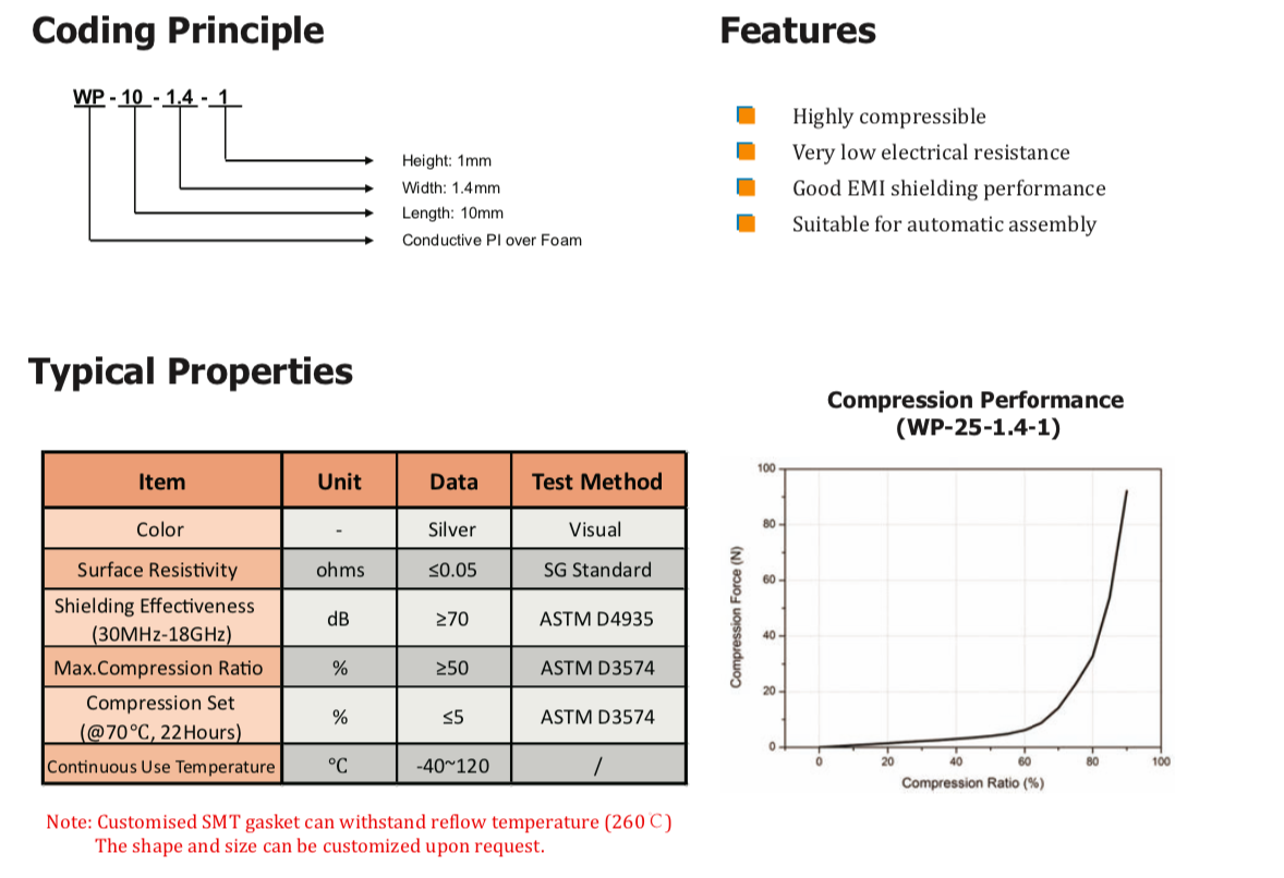 TMWP系列導(dǎo)電PI覆蓋泡棉材料由高導(dǎo)電Cu/Ni鍍層PI以及PU泡棉芯和導(dǎo)電壓敏丙烯酸粘合劑組成。這些材料具有極高的可壓縮性,專門設(shè)計(jì)用于提供卓越的EMI屏蔽和接地性能,并提供防塵和防潮保護(hù)。WP系列產(chǎn)品因其容易調(diào)整尺寸,適用于計(jì)算機(jī)、智能手機(jī)、LCD/TV和電信制造行業(yè)的固定墊圈應(yīng)用,可根據(jù)要求定制回流焊墊片。" />