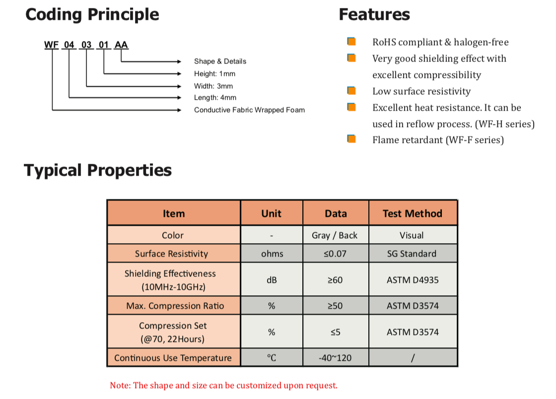 首頁 > 產品 > EMI/EMC 材料 > EMI屏蔽和接地墊片 > WF系列導電布包裹泡棉